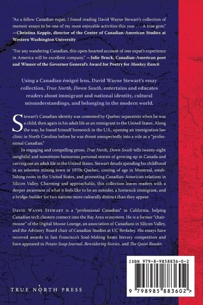 Using a Canadian émigré lens, David Wayne Stewart's essay collection, True North, Down South, entertains and educates readers about immigrant and national identity, cultural misunderstandings, and belonging in the modern world. Stewart's Canadian identity was contested by Quebec separatists when he was a child, then again in his adult life as an immigrant to the United States. Along the way, he found himself homesick in the U.S., opening an immigration law clinic in North Carolina before he was thrust unexpectedly into a role as a "professional Canadian." In engaging and compelling prose, True North, Down South tells twenty-eight insightful and sometimes humorous personal stories of growing up in Canada and carving out an adult life in the United States. Stewart details spending his childhood in an asbestos mining town in 1970s Quebec, coming of age in Montreal, establishing roots in the United States, and promoting Canadian-American relations in Silicon Valley. Charming and approachable, this collection leaves readers with a deeper awareness of what it feels like to be an outsider, a homesick immigrant, and a bridge-builder for two nations more culturally distinct than they appear.