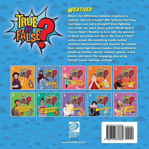 What's the difference between a typhoon, a cyclone, and a hurricane? Who believes that frog marriages can end a drought? Does lightning ever strike the same place twice? World Book's True or False?: Weather is here with the answers to these questions and more!