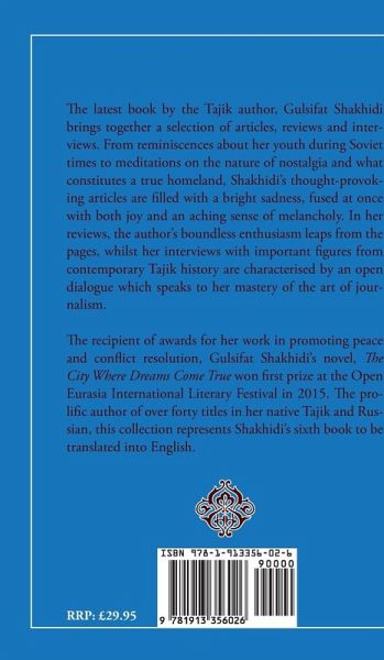 The latest book by the Tajik author, Gulsifat Shahidi brings together a selection of articles, reviews and interviews. From reminiscences about her youth during Soviet times to meditations on the nature of nostalgia and what constitutes a true homeland, Shahidi’s thought-provoking articles are filled with a bright sadness, fused at once with both joy and an aching sense of melancholy. In her reviews, the author’s boundless enthusiasm leaps from the pages, whilst her interviews with important figures from contemporary Tajik history are characterised by an open dialogue which speaks to her mastery of the art of journalism. The recipient of awards for her work in promoting peace and conflict resolution, Gulsifat Shahidi’s novel, The City Where Dreams Come True won first prize at the Open Eurasia International Literary Festival in 2015. The prolific author of over forty titles in her native Tajik and Russian, this collection represents Shahidi’s sixth book to be translated into English.