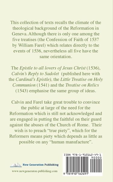 This collection of texts recalls the climate of the theological background of the Reformation in Geneva. Although there is only one among the five treatises (the Confession of Faith of 1537 by William Farel) which relates directly to the events of 1536, nevertheless all five have the same orientation. The Epistle to all lovers of Jesus Christ (1536), Calvin's Reply to Sadolet (published here with the Cardinal's Epistle), the Little Treatise on Holy Communion (1541) and the Treatise on Relics (1543) emphasise the same group of ideas. Calvin and Farel take great trouble to convince the public at large of the need for the Reformation is still not acknowledged and are engaged in putting the faithful on their guard against the abuses of the Church of Rome. Their wish is to preach "true piety", which for the Reformers means piety which depends as little as possible on any "human manufacture".