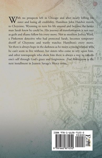With no prospects left in Chicago and after nearly killing his sister and losing all credibility, Hamilton John Hatcher travels to Cheyenne, Wyoming to turn his life around and become the better man Sarah knew he could be. His journey of transformation is not easy as guilt and shame follow his every move. Not to mention Joshua Ward, a Pinkerton detective who had protected Sarah, becomes temporary sheriff of Cheyenne and warily watches Hamilton's every move. Yet there is always hope in the darkness as he meets a young woman who he can't seem to live without, her sisters who come to rely upon him, and other townspeople who show him there is always a way to redeem one's self through God's grace and forgiveness. True Redemption is the next installment in Jeannie Savage's Mercy series.