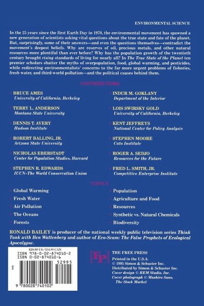 In the 25 years since the first Earth Day in 1970, the environmental movement has spawned a new generation of scientists asking vital questions about the true state and fate of the planet. But, surprisingly, some of their answers -- and even the questions themselves -- contradict the movement's deepest beliefs. Why are reserves of oil, precious metals, and other natural resources more plentiful than ever before? Why has the population growth of the twentieth century brought rising standards of living for nearly all? In The True State of the Planet ten premier scholars shatter the myths of overpopulation, food, global warming, and pesticides, while redirecting environmentalists' concerns to the far more urgent problems of fisheries, fresh water, and third-world pollution -- and the political causes behind them.