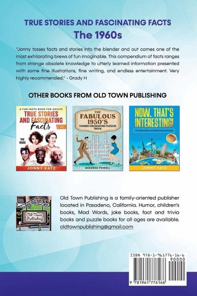 A New, Exciting Book of True Stories and Fascinating Facts all about the 1960s The True Stories in This Book Cover Interesting People and Events in Popular Culture; Sports; Science, Medicine and Technology; and the News. Here are a Few of the Story Titles: The Dictator Who Refused to Die "He Was a Friend of Mine" Machines Don't Keep Bankers' Hours No Measly Discovery Movie Goers Say "Yes" to Dr. No The United States Says, "Zip It" In the This and That Section you'll discover facts about other important events of the decade. What invention replaced steel and saved lives? What does a department store have to do with Andy Warhol? Who was Mary Quant? What rock concert was billed as "Three Days of Music and Peace? What were Bravo Smokes and what did they taste like? What invention from the 1960s is still vital to computer users today? What was Echo 1? Who was the First American in Space? The writer, Jonny Katz has also included a photo challenge. Can you name these celebrities from the 1960s? At the end of the book, you'll find some almanac information about each year from 1960-1969. Reading trivia and fact books comes with some amazing mental and social benefits: Improves Attention Span Enhances Memory Helps Retain Mental Health Reduces Stress Sharing Trivia Creates a Sense of Connectedness Buy this book now for yourself, a friend, or a loved-one. (You'll be glad you did.)