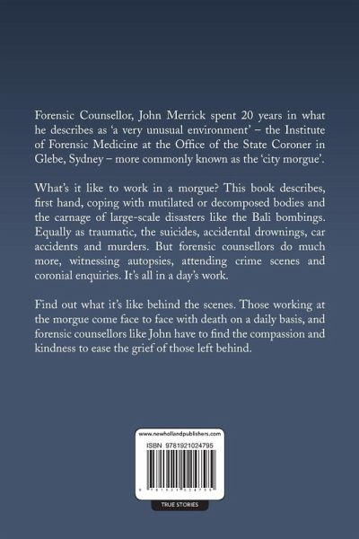 Forensic Counsellor, John Merrick spent 20 years in what he describes as 'a very unusual environment' - the Institute of Forensic Medicine at the Office of the State Coroner in Glebe, Sydney - more commonly known as the 'city morgue'. What's it like to work in a morgue? This book describes, first hand, coping with mutilated or decomposed bodies and the carnage of large-scale disasters like the Bali bombings. Equally traumatic, the suicides, accidental drowning, car accidents and murders. But forensic counsellors do much more, witnessing autopsies, attending crime scenes and coronial enquiries. It's all in a day's work. Find out what it's like behind the scenes, Those working at the morgue come face to face with death on a daily basis, and forensic counsellors like John have to find the compassion and kindness to ease the grief of those left behind.