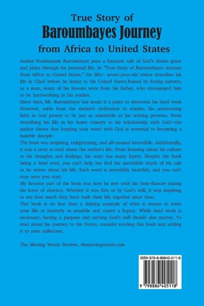 Author Noubaissem Baroumbaye pens a fantastic tale of God's divine grace and plans through his personal life. In "True Story of Baroumbayes Journey from Africa to United States," the fifty- seven-year-old writer describes his life in Chad before he heads to the United States. Raised by loving parents, as a man, many of his lessons were from his father, who encouraged him to be hardworking in his studies. Since then, Mr. Baroumbaye has made it a point to showcase his hard work However, aside from the author's dedication to studies, his unwavering faith in God proves to be just as admirable as his writing prowess. From describing his life in his home country to his relationship with God-the author shows that keeping your word with God is essential to becoming a humble disciple. The book was inspiring, enlightening, and all-around incredible. Additionally, it was a treat to read about the author's life. From learning about his culture to his thoughts and feelings, his story has many layers. Despite the book being a brief read, you can't help but feel the incredible depth of his tale as he writes about his life. Each word is incredibly heartfelt, and you can't stop once you start. My favorite part of the book was how he met with his then-fiancée during his leave of absence. Whether it was fate or by God's will, it was inspiring to see how much they have built their life together since then. This book is no less than a shining example of what it means to write your life as honestly as possible and create a legacy. While hard work is necessary, having a purpose and serving God's will should also matter. To read about his journey to the States, consider reading this book and adding it to your collection. The Moving Words Review, themovingwords.com