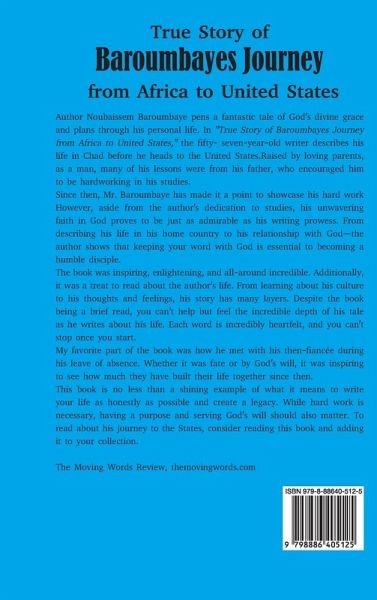 Author Noubaissem Baroumbaye pens a fantastic tale of God's divine grace and plans through his personal life. In "True Story of Baroumbayes Journey from Africa to United States," the fifty- seven-year-old writer describes his life in Chad before he heads to the United States. Raised by loving parents, as a man, many of his lessons were from his father, who encouraged him to be hardworking in his studies. Since then, Mr. Baroumbaye has made it a point to showcase his hard work However, aside from the author's dedication to studies, his unwavering faith in God proves to be just as admirable as his writing prowess. From describing his life in his home country to his relationship with God-the author shows that keeping your word with God is essential to becoming a humble disciple. The book was inspiring, enlightening, and all-around incredible. Additionally, it was a treat to read about the author's life. From learning about his culture to his thoughts and feelings, his story has many layers. Despite the book being a brief read, you can't help but feel the incredible depth of his tale as he writes about his life. Each word is incredibly heartfelt, and you can't stop once you start. My favorite part of the book was how he met with his then-fiancée during his leave of absence. Whether it was fate or by God's will, it was inspiring to see how much they have built their life together since then. This book is no less than a shining example of what it means to write your life as honestly as possible and create a legacy. While hard work is necessary, having a purpose and serving God's will should also matter. To read about his journey to the States, consider reading this book and adding it to your collection. The Moving Words Review, themovingwords.com