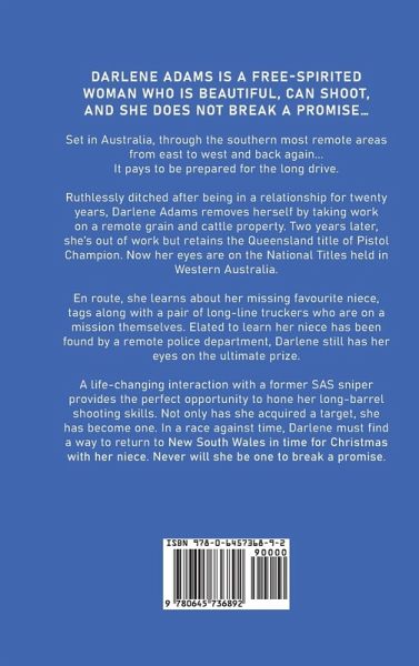 Set in Australia, through the southernmost remote areas from east to west and back again, it pays to be prepared for the long drive. Ruthlessly ditched after being in a relationship for twenty years, Darlene Adams removes herself from public appearances to rediscover herself by working on a remote grain and cattle property. Two years later, she's out of work but retains the Queensland title of Pistol Champion. Now her eyes are on the National Titles being held in Western Australia. Her beloved V8 Jeep gets transported to Perth in a sealed container and awaits her arrival while she drives a motorhome across the vast rugged land of Australia. Wrapping her slender hands around the prized gold-plated trophy is her goal. After befriending two long-haul truck drivers along the arduous bitumen trek, Darlene inadvertently becomes a guardian for not one but two rescued young women who have been abducted. The last thing she had in mind was babysitting. A life-changing interaction with a former SAS sniper provides the perfect opportunity to hone her long-barrel shooting skills. Not only has she acquired a target, she has become one. In a race against time, Darlene must return to New South Wales in time for Christmas. Never ever will she be the one to break a promise.