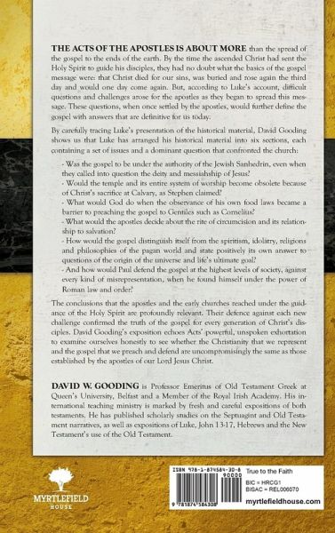 The Acts of the Apostles is about more than the spread of the gospel to the ends of the earth. By the time the ascended Christ had sent the Holy Spirit to guide his disciples, they had no doubt what the basics of the gospel message were: that Christ died for our sins, was buried and rose again the third day and would one day come again. But, according to Luke's account, difficult questions and challenges arose for the apostles as they began to spread this message. These questions, when once settled by the apostles, would further define the gospel with answers that are definitive for us today. By carefully tracing Luke's presentation of the historical material, David Gooding shows us that Luke has arranged his historical material into six sections, each containing a set of issues and a dominant question that confronted the church: - Was the gospel to be under the authority of the Jewish Sanhedrin, even when they called into question the deity and messiahship of Jesus? - Would the temple and its entire system of worship become obsolete because of Christ's sacrifice at Calvary, as Stephen claimed? - What would God do when the observance of his own food laws became a barrier to preaching the gospel to Gentiles such as Cornelius? - How would the apostles decide about the rite of circumcision and its relationship to salvation? - How would the gospel distinguish itself from the spiritism, idolatry, religions and philosophies of the pagan world and state positively its own answer to questions of the origin of the universe and life's ultimate goal? - And how would Paul defend the gospel at the highest levels of society, against every kind of misrepresentation, when he found himself under the power of Roman law and order? The conclusions that the apostles and the early churches reached under the guidance of the Holy Spirit are profoundly relevant. Their defence against each new challenge confirmed the truth of the gospel for every generation of Christ's disciples. David Gooding's exposition echoes Acts' powerful, unspoken exhortation to examine ourselves honestly to see whether the Christianity that we represent and the gospel that we preach and defend are uncompromisingly the same as those established by the apostles of our Lord Jesus Christ.