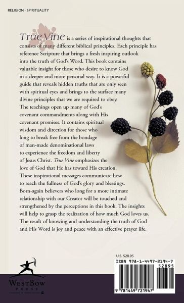 True Vine is a series of inspirational thoughts that consists of many different biblical principles. Each principle has reference Scripture that brings a fresh inspiring outlook into the truth of God's Word. This book contains valuable insight for those who desire to know God in a deeper and more personal way. It is a powerful guide that reveals hidden truths that are only seen with spiritual eyes and brings to the surface many divine principles that we are required to obey. The teachings open up many of God's covenant commandments along with His covenant promises. It contains spiritual wisdom and direction for those who long to break free from the bondage of man-made denominational laws to experience the freedom and liberty of Jesus Christ. True Vine emphasizes the love of God that He has toward His creation. These inspirational messages communicate how to reach the fullness of God's glory and blessings. Born-again believers who long for a more intimate relationship with our Creator will be touched and strengthened by the perceptions in this book. The insights will help to grasp the realization of how much God loves us. The result of knowing and understanding the truth of God and His Word is joy and peace with an effective prayer life.