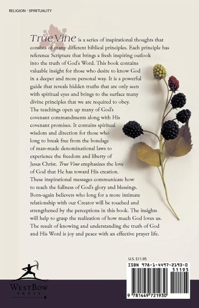 True Vine is a series of inspirational thoughts that consists of many different biblical principles. Each principle has reference Scripture that brings a fresh inspiring outlook into the truth of God's Word. This book contains valuable insight for those who desire to know God in a deeper and more personal way. It is a powerful guide that reveals hidden truths that are only seen with spiritual eyes and brings to the surface many divine principles that we are required to obey. The teachings open up many of God's covenant commandments along with His covenant promises. It contains spiritual wisdom and direction for those who long to break free from the bondage of man-made denominational laws to experience the freedom and liberty of Jesus Christ. True Vine emphasizes the love of God that He has toward His creation. These inspirational messages communicate how to reach the fullness of God's glory and blessings. Born-again believers who long for a more intimate relationship with our Creator will be touched and strengthened by the perceptions in this book. The insights will help to grasp the realization of how much God loves us. The result of knowing and understanding the truth of God and His Word is joy and peace with an effective prayer life.