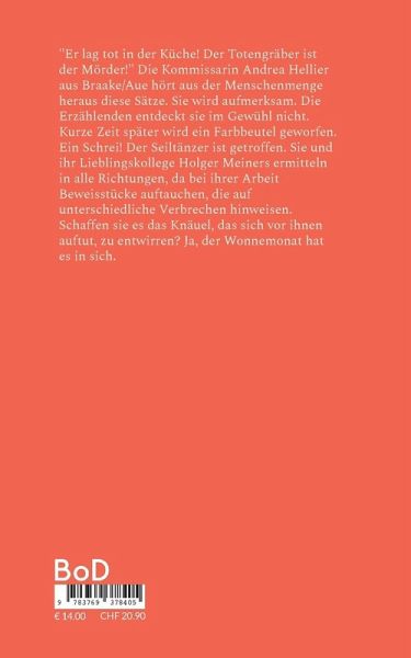 "Er lag tot in der Küche! Der Totengräber ist der Mörder!" Die Kommissarin Andrea Hellier aus Braake/Aue hört aus der Menschenmenge heraus diese Sätze. Sie wird aufmerksam. Die Erzählenden entdeckt sie im Gewühl nicht. Kurze Zeit später wird ein Farbbeutel geworfen. Ein Schrei! Der Seiltänzer ist getroffen. Sie und ihr Lieblingskollege Holger Meiners ermitteln in alle Richtungen, da bei ihrer Arbeit Beweisstücke auftauchen, die auf unterschiedliche Verbrechen hinweisen. Schaffen sie es das Knäuel, das sich vor ihnen auftut, zu entwirren? Ja, der Wonnemonat hat es in sich.