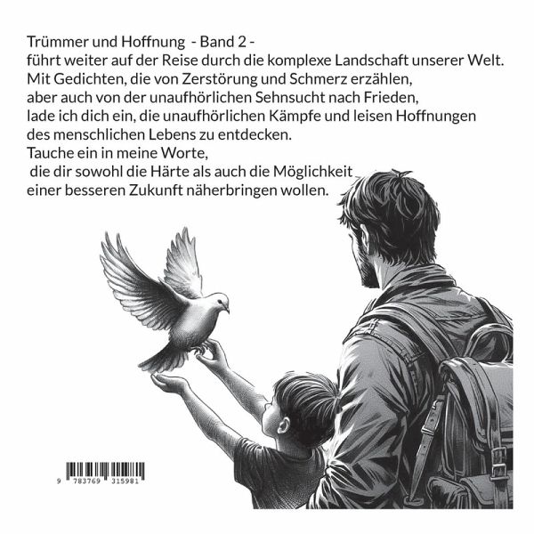 Trümmer und Hoffnung - Band 2 führt weiter auf der Reise durch die komplexe Landschaft unserer Welt. Mit Gedichten, die von Zerstörung und Schmerz erzählen, aber auch von der unaufhörlichen Sehnsucht nach Frieden, lade ich dich ein, die unaufhörlichen Kämpfe und leisen Hoffnungen des menschlichen Lebens zu entdecken. Tauche ein in meine Worte, die dir sowohl die Härte als auch die Möglichkeit einer besseren Zukunft näherbringen wollen.