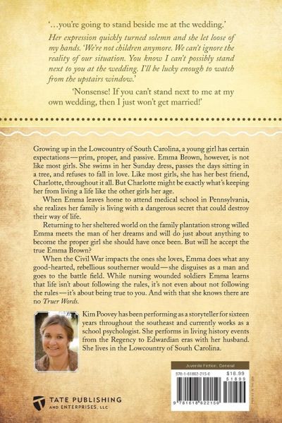 ...you're going to stand beside me at the wedding.' Her expression quickly turned solemn and she let loose of my hands. 'We're not children anymore. We can't ignore the reality of our situation. You know I can't possibly stand next to you at the wedding. I'll be lucky enough to watch from the upstairs window.' 'Nonsense! If you can't stand next to me at my own wedding, then I just won't get married!' Growing up in the Lowcountry of South Carolina, a young girl has certain expectations-prim, proper, and passive. Emma Brown, however, is not like most girls. She swims in her Sunday dress, passes the days sitting in a tree, and refuses to fall in love. Like most girls, she has her best friend, Charlotte, throughout it all. But Charlotte might be exactly what's keeping her from living a life like the other girls her age. When Emma leaves home to attend medical school in Pennsylvania, she realizes her family is living with a dangerous secret that could destroy their way of life. Returning to her sheltered world on the family plantation strong willed Emma meets the man of her dreams and will do just about anything to become the proper girl she should have once been. But will he accept the true Emma Brown? When the Civil War impacts the ones she loves, Emma does what any good-hearted, rebellious southerner would-she disguises as a man and goes to the battle field. While nursing wounded soldiers Emma learns that life isn't about following the rules, it's not even about not following the rules-it's about being true to you. And with that she knows there are no Truer Words.