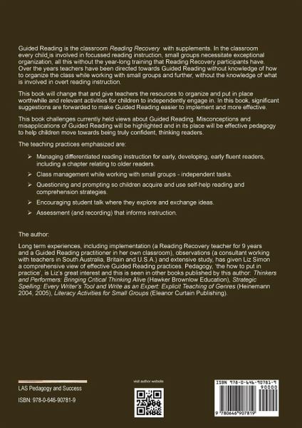 Guided Reading is the classroom Reading Recovery with supplements. In the classroom every child is involved in focussed reading instruction, small groups necessitate exceptional organization, all this without the year-long training that Reading Recovery participants have. Over the years teachers have been directed towards Guided Reading without knowledge of how to organize the class while working with small groups and further, without the knowledge of what is involved in overt reading instruction. This book will change that and give teachers the resources to organize and put in place worthwhile and relevant activities for children to independently engage in. In this book, significant suggestions are forwarded to make Guided Reading easier to implement and more effective. This book challenges held views about Guided Reading - misconceptions and misapplications of Guided Reading will be highlighted and in place will be effective pedagogy to help children move towards being truly confident, thinking readers. The teaching practices emphasized are: * Managing differentiated reading instruction for early, developing, early fluent readers, including a chapter relating to older readers. * Class management while working with small groups - independent tasks. * Questioning and prompting so children acquire and use self-help reading and comprehension strategies. * Encouraging student talk where they explore and exchange ideas. * Assessment (and recording) that informs instruction. The Author: Long term experiences, including implementation (a Reading Recovery teacher for 9 years and a Guided Reading practitioner in her own classroom), observations (a consultant working with teachers in South Australia, Britain and U.S.A.) and extensive study, has given Liz Simon a comprehensive view of effective Guided Reading practices. Pedagogy, 'the how to put in practice', is Liz's great interest and this is seen in other books published by this author: Thinkers and Performers: Bringing Critical Thinking Alive (Hawker Brownlow Education), Strategic Spelling: Every Writer's Tool and Write as an Expert: Explicit Teaching of Genres (Heinemann 2004, 2005), Literacy Activities for Small Groups (Eleanor Curtain Publishing).