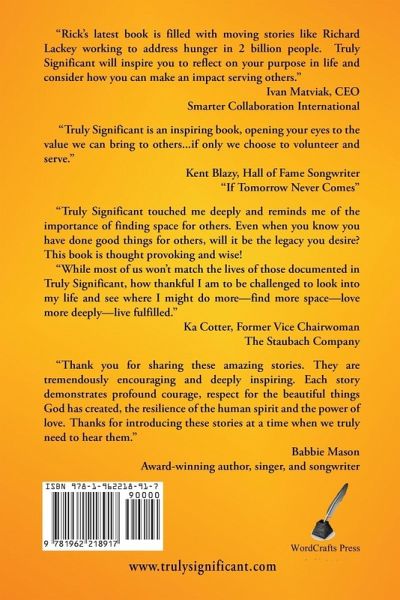 Truly Significant: Conversations with Big Hearted People is more than a book-it is a collection of stories from ordinary people who experienced extraordinary transformations. These are not tales of wealth or fame, but of lives changed, hearts opened, and communities uplifted. Each story reminds us of the incredible power of choice-the choice to live with purpose, to align our actions with values that matter, and to leave a legacy of hope. Kindness, generosity, and philanthropy aren't just lofty ideals. They're the tools that build bridges, the sparks that light dark corners, and the actions that transform intentions into impact. And when you finish this book, reflect on what your story might say. Not about your possessions or accomplishments, but about the lives you have touched and the love you shared. Imagine this: your final check bounces -not because you miscalculated, but because you gave all you had. What remains is not the wealth you accumulated, but the legacy of significance you left behind.