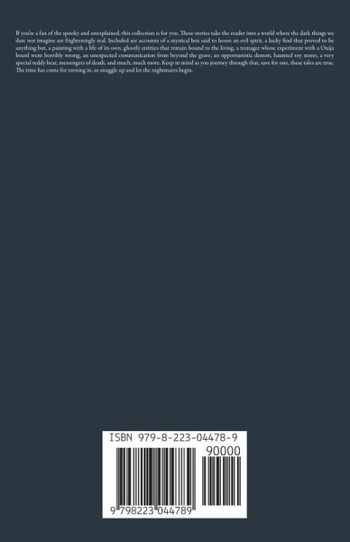 If you're a fan of the spooky and unexplained, this collection is for you. These stories take the reader into a world where the dark things we dare not imagine are frighteningly real. Included are accounts of a mystical box said to house an evil spirit, a lucky find that proved to be anything but, a painting with a life of its own, ghostly entities that remain bound to the living, a teenager whose experiment with a Ouija board went horribly wrong, an unexpected communication from beyond the grave, an opportunistic demon, haunted toy stores, a very special teddy bear, messengers of death, and much, much more. Keep in mind as you journey through that, save for one, these tales are true. The time has come for turning in, so snuggle up and let the nightmares begin.