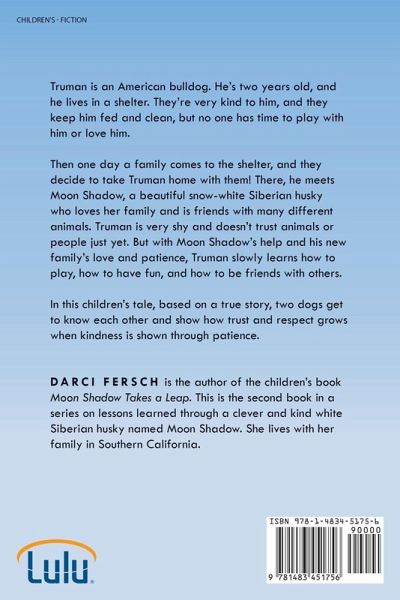 Truman is an American bulldog. He's two years old, and he lives in a shelter. They're very kind to him, and they keep him fed and clean, but no one has time to play with him or love him. Then one day a family comes to the shelter, and they decide to take Truman home with them! There, he meets Moon Shadow, a beautiful snow-white Siberian husky who loves her family and is friends with many different animals. Truman is very shy and doesn't trust animals or people just yet. But with Moon Shadow's help and his new family's love and patience, Truman slowly learns how to play, how to have fun, and how to be friends with others. In this children's tale, based on a true story, two dogs get to know each other and show how trust and respect grows when kindness is shown through patience.