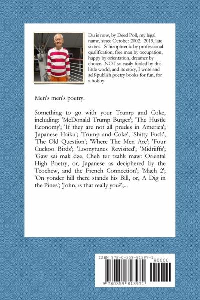 Men's men's poetry. Something to go with your Trump and Coke, including: 'McDonald Trump Burger'; 'The Hustle Economy'; 'If they are not all prudes in America'; 'Japanese Haiku'; 'Trump and Coke'; 'Shitty Fuck'; 'The Old Question'; 'Where The Men Are'; 'Four Cuckoo Birds'; 'Loonytunes Revisited'; 'Midriffs'; 'Gaw sai mak dze, Cheh ter tzahk maw: Oriental High Poetry, or, Japanese as deciphered by the Teochew, and the French Connection'; 'Mach 2'; 'On yonder hill there stands his Bill, or, A Dig in the Pines'; 'John, is that really you?';...