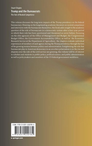 This volume discusses the long term impacts of the Trump presidency on the federal bureaucracy. Drawing on the longstanding academic literature on neutral competence and interviews with the bureaucrats themselves, this book adds insight to the academic question of the role of bureaucrats in a democratic system after a four-year period in which their role has been questioned and threatened as never before. Focusing on the elite agencies of the Office of Management and Budget, the Congressional Budget Office, the Government Accountability Office, as well as the Economic Research Service at the Department of Agriculture, the chapters evaluate individual experiences of members of each agency during the Trump presidency through the lens of the growing tension between politics and administration. Enlightening the role that bureaucrats play in American democracy in an era when polarization is on the rise and disputes over the role of the civil service are growing, this volume will be ofinterest to scholars and students in public policy, political science, and public administration as well as policymakers and members of the US federal government workforce.