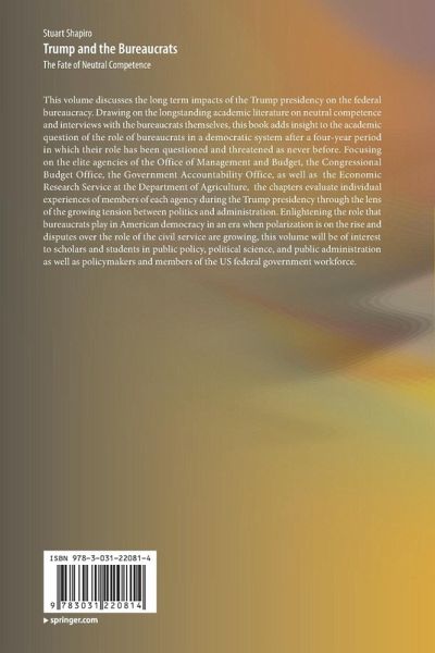 This volume discusses the long term impacts of the Trump presidency on the federal bureaucracy. Drawing on the longstanding academic literature on neutral competence and interviews with the bureaucrats themselves, this book adds insight to the academic question of the role of bureaucrats in a democratic system after a four-year period in which their role has been questioned and threatened as never before. Focusing on the elite agencies of the Office of Management and Budget, the Congressional Budget Office, the Government Accountability Office, as well as the Economic Research Service at the Department of Agriculture, the chapters evaluate individual experiences of members of each agency during the Trump presidency through the lens of the growing tension between politics and administration. Enlightening the role that bureaucrats play in American democracy in an era when polarization is on the rise and disputes over the role of the civil service are growing, this volume will be ofinterest to scholars and students in public policy, political science, and public administration as well as policymakers and members of the US federal government workforce.