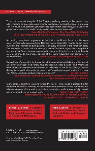 Table of Contents The Trump Effect: Disruption and Its Consequences in US Politics and Government Chapter One:Trust and Anger in the Trump Era, Todd E. Eberly, St. Mary's College of Maryland Chapter Two:How Trump Changed the Republican Party-and the Democrats Too, David A. Hopkins, Boston College Chapter Three:Trump's Effect on the Media World and Coverage of Presidents, Diana M. Owen, Georgetown University Chapter Four:The Legacies of Trump's Battles with Congress, Kathryn A. Pearson, University of Minnesota - Twin Cities Chapter Five:Trump's Management of the Executive Branch, Karen M. Hult, Virginia Polytechnic Institute and State University Chapter Six:Storming the Courts: The Trump Administration's Judicial Agenda, Nancy L. Maveety, Tulane University Chapter Seven:Domestic Policy Legacies of the Trump Presidency, Andrew E. Busch, Claremont McKenna College Chapter Eight:Challenging the World: Trump Foreign Policy, Steven E. Schier, Carleton College