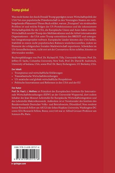 Was steckt hinter der durch Donald Trump geprägten neuen Wirtschaftspolitik der USA? Ist eine populistische Präsidentschaft in den Vereinigten Staaten ein vorübergehendes Phänomen? Dieses Buch erklärt, warum "Trumpism" ein strukturelles Problem ist und welche Folgen der US-Protektionismus und die inkonsistente Wirtschaftspolitik für die USA, die Europäische Union und Asien haben werden. Wirtschaftlich zerstört Trump den Multilateralismus und die Arbeit internationaler Organisationen - die USA unter Trump unterstützen den BREXIT und untergraben Integrationsprojekte weltweit. Europäische Länder könnten den USA helfen, Stabilität in einem nicht-populistischen Rahmen wiederherzustellen, indem sie Elemente der erfolgreichen Sozialen Marktwirtschaft exportieren. Schwächen im US-Gesundheitssystem, nicht erst seit der Coronavirus-Krise sichtbar, könnten so überwunden werden.