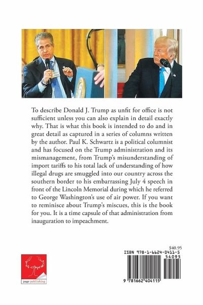 To describe Donald J. Trump as unfit for office is not sufficient unless you can also explain in detail exactly why. That is what this book is intended to do and in great detail as captured in a series of columns written by the author. Paul Schwartz is a political columnist and has focused on the Trump administration and its mismanagement, from Trump's misunderstanding of import tariffs to his total lack of understanding of how illegal drugs are smuggled into our country across the southern border to his embarrassing July 4 speech in front of the Lincoln Memorial during which he referred to George Washington's use of air power. If you want to reminisce about Trump's miscues, this is the book for you. It is a time capsule of that administration from inauguration to impeachment.