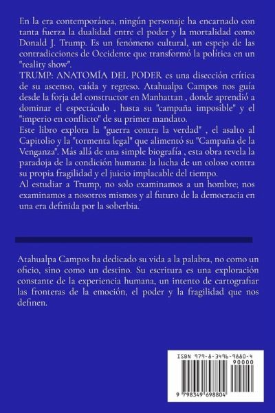 El poder revela. Y a ningún hombre lo ha revelado con tanta crudeza como a Donald J. Trump. De constructor de torres doradas a comandante en jefe, su vida ha sido un desafío constante a los límites de la ambición, la ley y la verdad. Atahualpa Campos, traza en esta obra definitiva la anatomía de un fenómeno: la epopeya de un líder que se alimentó del caos, transformó la política en espectáculo y convenció a millones de que solo él podía salvarlos. ¿Este libro es la crónica de una soberbia que erigió un imperio y una fragilidad que lo amenaza desde adentro. Desde su sorprendente victoria, pasando por los juicios que buscaron derribarlo, hasta su regreso al poder en una campaña de venganza, Trump: Anatomía del Poder es un viaje al corazón de una era definida por la discordia. ¿Más que la historia de un presidente, es un espejo de nosotros mismos y una advertencia sobre la delgada línea que separa la democracia del autoritarismo. Un análisis valiente y esencial para entender el presente y anticipar el futuro.
