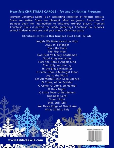 Trumpet Christmas Duets by Eddie Lewis Intermediate level trumpet duet arrangements of popular Christmas carols. Christmas carols in this trumpet duet book include:Angels We Have Heard on High Away in a Manger Deck the Halls The First Noel God Rest Ye Merry Gentlemen Good King Wenceslas Hark the Herald Angels Sing The Holly and the Ivy In the Bleak Midwinter It Came Upon a Midnight Clear Joy to the World Let All Mortal Flesh Keep Silence O Come, All Ye Faithful O Come, O Come, Emmanuel O Holy Night! O Little Town of Bethlehem Quempas Carol Silent Night Still, Still, Still We Three Kings of Orient Are What Child Is This