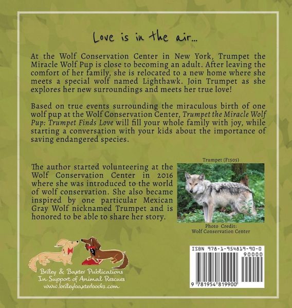 At the Wolf Conservation Center in New York, Trumpet the Miracle Wolf Pup is close to becoming an adult. After leaving the comfort of her family, she is relocated to a new home where she meets a special wolf named Lighthawk. Join Trumpet as she explores her new surroundings and meets her true love! Based on true events surrounding the miraculous birth of one wolf pup at the Wolf Conservation Center, Trumpet the Miracle Wolf Pup: Trumpet Finds Love will fill your whole family with joy, while starting a conversation with your kids about the importance of saving endangered species.