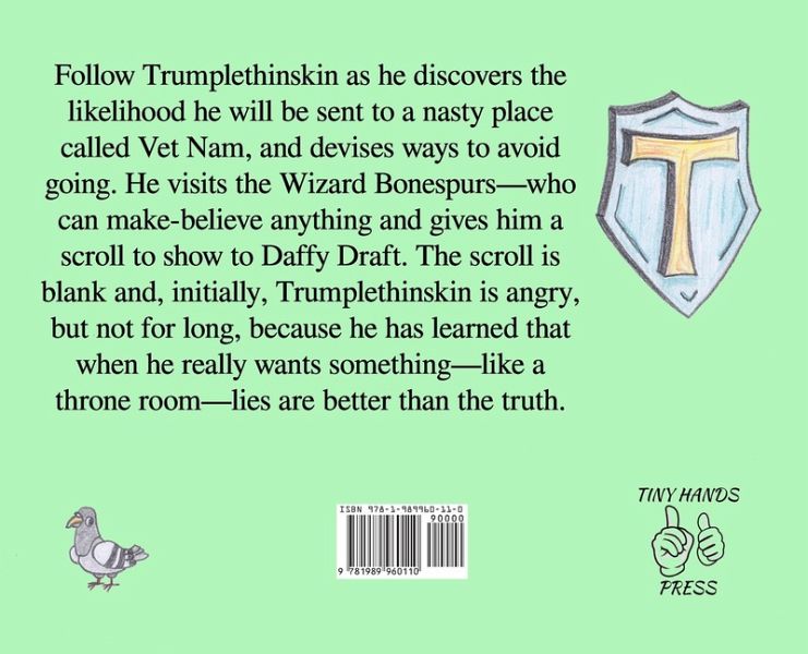 The Tales of Trumplethinskin is a trilogy of satirical, children's style books based around a humorous, illustrated storybook concept. The titles are: * Trumplethinskin and the Wizard Bonespurs * Trumplethinskin in the Land of UcK * Trumplethinskin and the Gigantic Peach. In Trumplethinskin and the Wizard Bonespurs, follow Trumplethinskin as he discovers the likelihood he will be sent to a nasty place called Vet Nam, and devises ways to avoid going. He visits the Wizard Bonespurs-who can make-believe anything and gives him a scroll to show to Daffy Draft. The scroll is blank and, initially, Trumplethinskin is angry, but not for long, because he has learned that when he really wants something-like a throne room-lies are better than the truth.