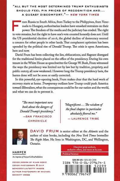 From Russia to South Africa, from Turkey to the Philippines, from Venezuela to Hungary, authoritarian leaders have smashed restraints on their power. The freedom of the media and the judiciary has eroded. The right to vote remains, but the right to have one’s vote counted honestly does not. Until the US presidential election of 2016, the global decline of democracy seemed a concern for other people in other lands. That complacent optimism has been upended by the political rise of Donald Trump. The crisis is upon Americans, here and now. David Frum has been collecting the lies, obfuscations, and flagrant disregard for the traditional limits placed on the office of the presidency. During his own tenure in the White House as speechwriter for George W. Bush, Frum witnessed the ways the presidency was limited not by law but by tradition, propriety, and public outcry, all now weakened. However long the Trump presidency lasts, the harms done will not be soon or easily corrected. In this powerful, eye-opening book, Frum makes clear that the hard work of recovery starts at home. Trumpocracy outlines how Trump could push America toward illiberalism, what the consequences could be for our nation and the world, and what we can do to prevent it.