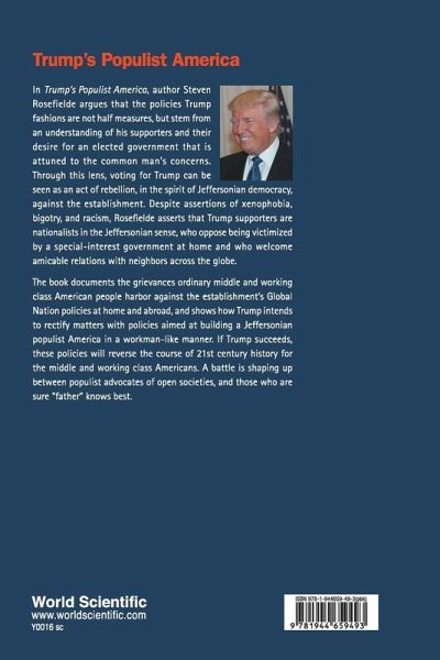 In Trump's Populist America, author Steven Rosefielde argues that the policies Trump fashions are not half measures, but stem from an understanding of his supporters and their desire for an elected government that is attuned to the common man's concerns. Through this lens, voting for Trump can be seen as an act of rebellion, in the spirit of Jeffersonian democracy, against the establishment. Despite assertions of xenophobia, bigotry, and racism, Rosefielde asserts that Trump supporters are nationalists in the Jeffersonian sense, who oppose being victimized by a special-interest government at home and who welcome amicable relations with neighbors across the globe. The book documents the grievances ordinary middle and working class American people harbour against the establishment's Global Nation policies at home and abroad, and shows how Trump intends to rectify matters with policies aimed at building a Jeffersonian populist America in a workman-like manner. If Trump succeeds, these policies will reverse the course of 21st century history for the middle and working class Americans. A battle is shaping up between populist advocates of open societies, and those who are sure "father" knows best.