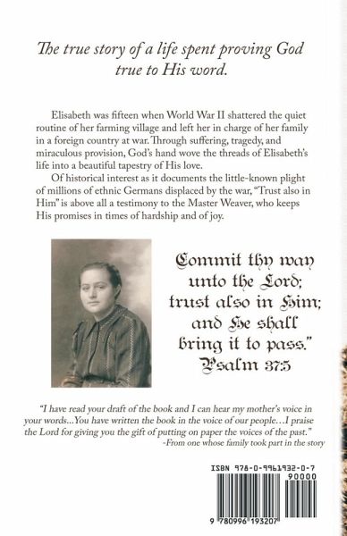 Elisabeth was fifteen when World War II shattered the quiet routine of her farming village and left her in charge of her family in a foreign country at war. Through suffering, tragedy, and miraculous provision, God's hand wove the threads of Elisabeth's life into a beautiful tapestry of His love. Of historical interest as it documents the little-known plight of millions of ethnic Germans displaced by the war, "Trust also in Him" is above all a testimony to the Master Weaver, who keeps His promises in times of hardship and of joy.