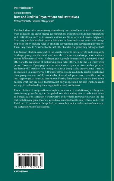 This book shows that evolutionary game theory can unravel how mutual cooperation, trust, and credit in a group emerge in organizations and institutions. Some organizations and institutions, such as insurance unions, credit unions, and banks, originated from very simple mutual-aid groups. Members in these early-stage mutual-aid groups help each other, making rules to promote cooperation, and suppressing free riders. Then, they come to "trust" not only each other but also the group they belong to, itself.