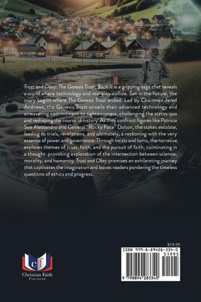 Trust and Obey: The Genesis Trust, Book II is a gripping saga that reveals a world where technology and morality collide. Set in the future, the story begins where The Genesis Trust ended. Led by Chairman Jared Andrews, the Genesis Trust unveils their advanced technology and unwavering commitment to righteousness, challenging the status quo and reshaping the course of history. As they confront figures like Patricia Sue Alessandro and General "Rocky Face" Dalton, the stakes escalate, leading to trials, revelations, and ultimately, a reckoning with the very essence of power and governance. Through twists and turns, the narrative explores themes of trust, faith, and the pursuit of faith, culminating in a thought-provoking exploration of the intersection between science, morality, and humanity. Trust and Obey promises an exhilarating journey that captivates the imagination and leaves readers pondering the timeless questions of ethics and progress.