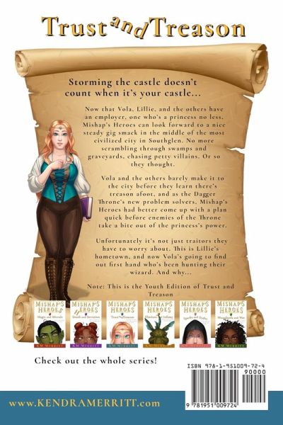 Storming the castle doesn't count when it's your own castle... Now that they have an employer, one who is a princess no less, Mishap's Heroes can look forward to a nice steady gig smack in the middle of the most civilized city in Southglen. No more running around, scrambling after petty villains. Or so they thought. Vola and the others barely make it to the city before they learn there's treason afoot and as the Dagger Throne's new problem solvers, Mishap's Heroes had better come up with a plan quick before enemies of the Throne take a bite out of the princess's power. Unfortunately it's not just traitors they have to worry about. This is Lillie's hometown and now Vola's going to find out first hand who's been hunting their wizard. And why. Note: This is the Youth Edition of Trust and Treason. Appropriate for ages 8-12