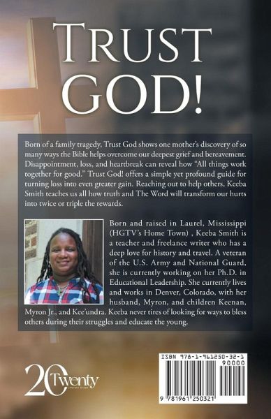 Born of a family tragedy, Trust God shows one mother's discovery of so many ways the Bible helps overcome our deepest grief and bereavement. Disappointment, loss, and heartbreak can reveal how "All things work together for good." Trust God! offers a simple yet profound guide for turning loss into even greater gain. Reaching out to help others, Keeba Smith teaches us all how truth and The Word will transform our hurts into twice or triple the rewards. Born and raised in Laurel, Mississippi (HGTV's Home Town) , Keeba Smith is a teacher and freelance writer who has a deep love for history and travel. A veteran of the U.S. Army and National Guard, she is currently working on her Ph.D. in Educational Leadership. She currently lives and works in Denver, Colorado, with her husband, Myron, and children Keenan, Myron Jr., and Kee'undra. Keeba never tires of looking for ways to bless others during their struggles and educate the young.