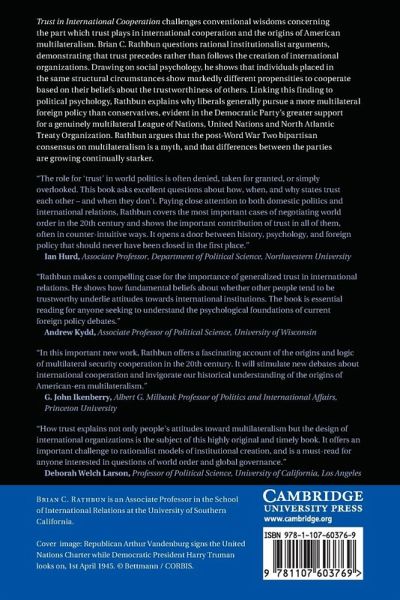 'The role for 'trust' in world politics is often denied, taken for granted, or simply overlooked. This book asks excellent questions about how, when, and why states trust each other - and when they don't. Paying close attention to both domestic politics and international relations, Rathbun covers the most important cases of negotiating world order in the [twentieth] century and shows the important contribution of trust in all of them, often in counter-intuitive ways. It opens a door between history, psychology, and foreign policy that should never have been closed in the first place.' Ian Hurd, Associate Professor, Department of Political Science, Northwestern University