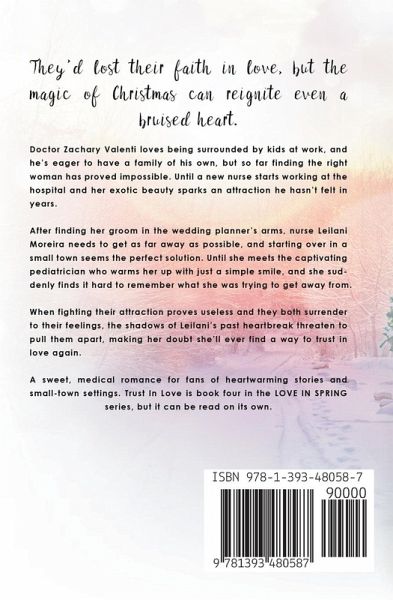 They'd lost their faith in love, but the magic of Christmas can reignite even a bruised heart. Doctor Zachary Valenti loves being surrounded by kids at work, and he's eager to have a family of his own, but so far finding the right woman has proved impossible. Until a new nurse starts working at the hospital and her exotic beauty sparks an attraction he hasn't felt in years. After finding her groom in the wedding planner's arms, nurse Leilani Moreira needs to get as far away as possible, and starting over in a small town seems the perfect solution. Until she meets the captivating pediatrician who warms her up with just a simple smile, and she suddenly finds it hard to remember what she was trying to get away from. When fighting their attraction proves useless and they both surrender to their feelings, the shadows of Leilani's past heartbreak threaten to pull them apart, making her doubt she'll ever find a way to trust in love again. A sweet, medical romance for fans of heartwarming stories and small-town settings. Trust In Love is book four in the Love In Spring series, but it can be read on its own.