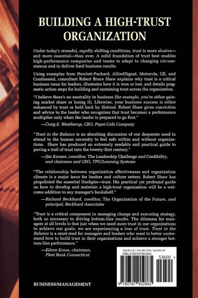 Under today's stressful, rapidly shifting conditions, trust is more elusive--and more essential--than ever. A solid foundation of trust best enables high-performance companies and teams to adapt to changing circumstances and to deliver hard business results.Using examples from Hewlett-Packard, AlliedSignal, Motorola, GE, and Continental, consultant Robert Bruce Shaw explains why trust is a critical business issue for leaders, illustrates how it is won or lost, and details pragmatic action steps for building and sustaining trust across the organization.