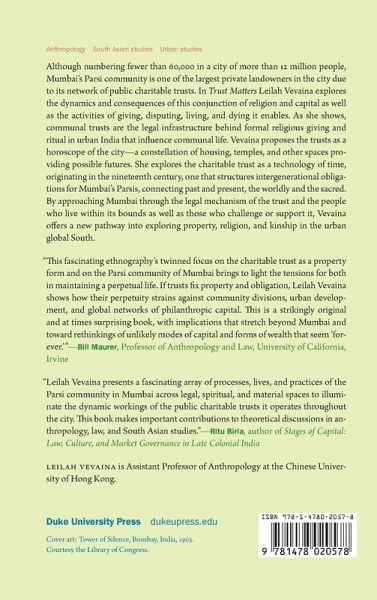 Although numbering fewer than 60,000 in a city of more than 12 million people, Mumbai's Parsi community is one of the largest private landowners in the city due to its network of public charitable trusts. In Trust Matters Leilah Vevaina explores the dynamics and consequences of this conjunction of religion and capital as well as the activities of giving, disputing, living, and dying it enables. As she shows, communal trusts are the legal infrastructure behind formal religious giving and ritual in urban India that influence communal life. Vevaina proposes the trusts as a horoscope of the city-a constellation of housing, temples, and other spaces providing possible futures. She explores the charitable trust as a technology of time, originating in the nineteenth century, one that structures intergenerational obligations for Mumbai's Parsis, connecting past and present, the worldly and the sacred. By approaching Mumbai through the legal mechanism of the trust and the people who live within its bounds as well as those who challenge or support it, Vevaina offers a new pathway into exploring property, religion, and kinship in the urban global South.