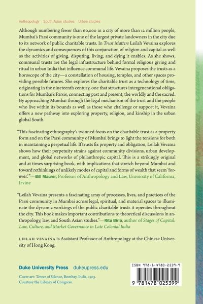 Although numbering fewer than 60,000 in a city of more than 12 million people, Mumbai's Parsi community is one of the largest private landowners in the city due to its network of public charitable trusts. In Trust Matters Leilah Vevaina explores the dynamics and consequences of this conjunction of religion and capital as well as the activities of giving, disputing, living, and dying it enables. As she shows, communal trusts are the legal infrastructure behind formal religious giving and ritual in urban India that influence communal life. Vevaina proposes the trusts as a horoscope of the city-a constellation of housing, temples, and other spaces providing possible futures. She explores the charitable trust as a technology of time, originating in the nineteenth century, one that structures intergenerational obligations for Mumbai's Parsis, connecting past and present, the worldly and the sacred. By approaching Mumbai through the legal mechanism of the trust and the people who live within its bounds as well as those who challenge or support it, Vevaina offers a new pathway into exploring property, religion, and kinship in the urban global South.