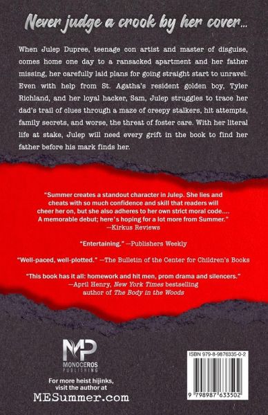 NEVER JUDGE A CROOK BY HER COVER. Julep Dupree tells lies. A lot of them. She's a con artist, a master of disguise, and a sophomore at Chicago's swanky St. Agatha High, where her father, an old-school grifter with a weakness for the ponies, sends her so she can learn to mingle with the upper crust. For extra spending money, Julep runs petty scams for her classmates while dodging the dean of students and maintaining an A+ (okay, A-) average. She's a fixer, and she's good at it. But it's not what she wants. And soon, she'll hang up her grifter skills for good. But when she comes home one day to a ransacked apartment and her father missing, Julep's carefully laid plans for going straight start to unravel. Even with help from St. Agatha's resident Prince Charming, Tyler Richland, and her loyal hacker, Sam, Julep struggles to trace her dad's trail of clues through a maze of creepy stalkers, hit attempts, family secrets, and worse, the threat of foster care. With her literal life at stake, Julep will need to use every grift in the book to find and save her dad before his mark finds--and eliminates--her. ¿¿¿¿Fans of Ally Carter's Heist Society novels will love this teen mystery/thriller with sarcastic wit, a hint of romance, and Ocean's Eleven-inspired action. Will Julep outsmart her enemies and find her father? Or is she too late? Buy the book now to join Julep's crack team and discover each new twist along the way.