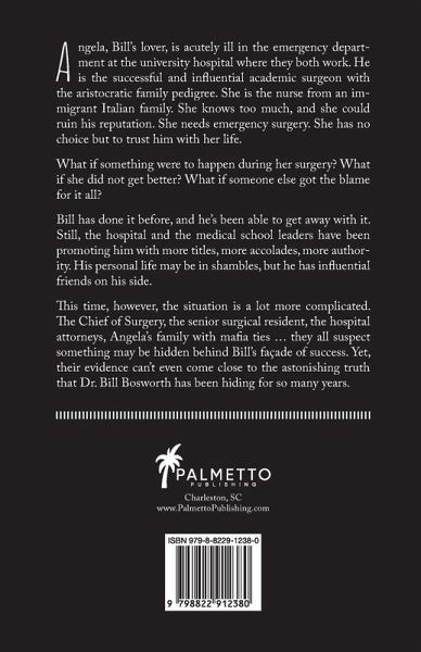 Angela, Bill's lover, is acutely ill in the emergency department at the university hospital where they both work. He is the successful and influential academic surgeon with the aristocratic family pedigree. She is the nurse from an immigrant Italian family. She knows too much, and she could ruin his reputation. She needs emergency surgery. She has no choice but to trust him with her life. What if something were to happen during her surgery? What if she did not get better? What if someone else got the blame for it all? Bill has done it before, and he's been able to get away with it. Still, the hospital and the medical school leaders have been promoting him with more titles, more accolades, more authority. His personal life may be in shambles, but he has influential friends on his side. This time, however, the situation is a lot more complicated. The Chief of Surgery, the senior surgical resident, the hospital attorneys, Angela's family with mafia ties ... they all suspect something may be hidden behind Bill's façade of success. Yet, their evidence can't even come close to the astonishing truth that Dr. Bill Bosworth has been hiding for so many years.