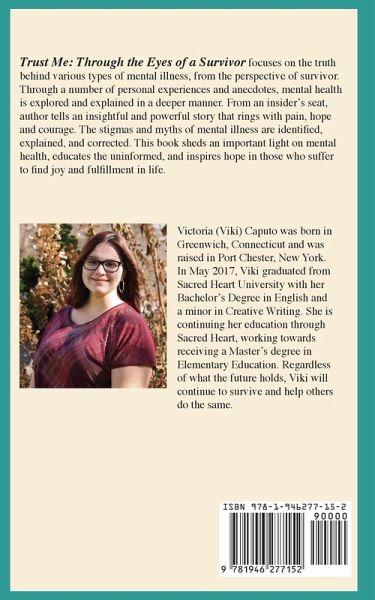 Trust Me: Through the Eyes of a Survivor focuses on the truth behind various types of mental illness, from the perspective of survivor. Through a number of personal experiences and anecdotes, mental health is explored and explained in a deeper manner. From an insider’s seat, author tells an insightful and powerful story that rings with pain, hope and courage. The stigmas and myths of mental illness are identified, explained, and corrected. This book sheds an important light on mental health, educates the uninformed, and inspires hope in those who suffer to find joy and fulfillment in life. Editor’s Note Victoria "Viki" Caputo was in elementary school when she moved from her hometown of Port Chester, NY, to Greenwich, CT. When the seventh grade rolled around, things took a turn for the worse. Bullying, gossiping, and the overall hostility of Viki’s classmates led to bouts of depression, eating disorders, body dysmorphia, and the constant emotions of loneliness and emptiness. The combination of these mental illnesses and emotions led to an eventual suicide attempt on January 14th, 2013. After recovering from her injuries, Viki has since made it her mission to help those around her who are similar situations. Through her experiences, Viki wants to make it known to her audience that you are truly never alone, and that there is a way to survive, even when it seems impossible. This book is a story about Viki Caputo. It is her life on paper. All the experiences, emotions, illnesses, and battles. It is also about some of her victories over mental illness and inspirational hope for those currently suffering from similar trials. Nothing here is to be construed as medical advice or prescription of any sort. These are Viki’s lived experiences - shared with the expectation that they may be helpful to someone reading this material. You may ask yourself, why should I care? In what way will her story help me? The answer is simple: you just need to trust her. Read with an open mind – you may be pleasantly surprised. Viki Caputo has been there. Now, she wants to help prevent others from experiencing the same difficulties and anguish she passed through. For a 22-year old, the insights she brings to this important issue are quite impressive, and likely to resonate with young adults.