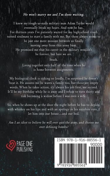 He won't marry me and I'm done waiting. I knew my tough-as-nails military man Adam Taylor would eventually break my heart. And now he has. For thirteen years I've patiently waited for my high school crush turned soulmate to start a family with me. But there always seems to be just one more mission between us finally moving away from this army base. He promised me that his career in the military wouldn't be forever, but here we are. Stuck. Living together only half of the time when he is home between assignments. My biological clock is ticking so loudly, I'm surprised he doesn't hear it. He assures me he wants a family too, but those are empty words. When he takes action, it's always his job first, me second. It'll be my birthday while he is away and I refuse to turn thirty and risk becoming a widow before I was even a wife. So, when he shows up at the door the night before he has to deploy, with whiskey on his lips and with an apology in his sapphire eyes, I let him into our house…and our bed. Am I an idiot to believe he will ever quit the army, and choose me over defusing bombs?