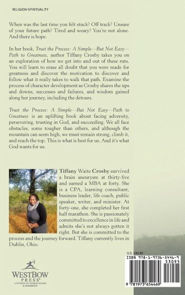 When was the last time you felt stuck? Off track? Unsure of your future path? Tired and weary? You're not alone. And there is hope. In her book, Trust the Process: A Simple-But Not Easy-Path to Greatness, author Tiffany Crosby takes you on an exploration of how we get into and out of these ruts. You will learn to erase all doubt that you were made for greatness and discover the motivation to discover and follow what it really takes to walk that path. Examine the process of character development as Crosby shares the ups and downs, successes and failures, and wisdom gained along her journey, including the detours. Trust the Process: A Simple-But Not Easy-Path to Greatness is an uplifting book about facing adversity, persevering, trusting in God, and succeeding. We all face obstacles, some tougher than others, and although the mountain can seem high, we must remain strong, climb it, and reach the top. This is what is best for us. And it's what God wants for us.