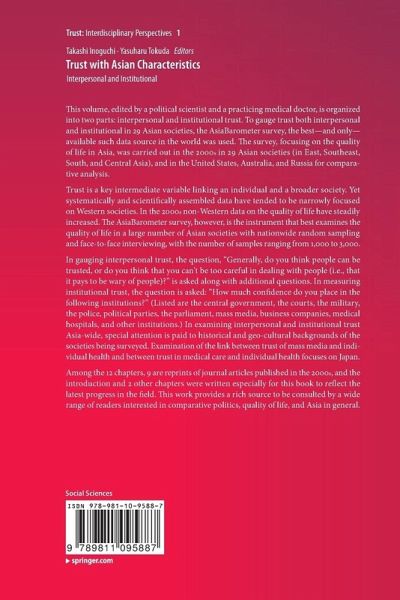 In gauging interpersonal trust, the question, "Generally, do you think people can be trusted, or do you think that you can't be too careful in dealing with people (i.e., that it pays to be wary of people)?" is asked along with additional questions. In measuring institutional trust, the question is asked: "How much confidence do you place in the following institutions?" (Listed are the central government, the courts, the military, the police, political parties, the parliament, mass media, business companies, medical hospitals, and other institutions.) In examining interpersonal and institutional trust Asia-wide, special attention is paid to historical and geo-cultural backgrounds of the societies being surveyed. Examination of the link between trust of mass media and individual health and between trust in medical care and individual health focuses on Japan.Among the 12 chapters, 9 are reprints of journal articles published in the 2000s, and the introduction and 2 other chapters were written especially for this book to reflect the latest progress in the field. This work provides a rich source to be consulted by a wide range of readers interested in comparative politics, quality of life, and Asia in general.