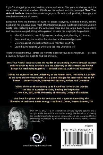 If you're struggling to stay positive, you're not alone. The pace of change and the nonexistent norm make us feel off-balance, burned out, and disconnected. Trust Your Animal Instincts reveals how to recharge your life and spark positivity through your own limitless source of power. Exhausted from the burnout of trying to please everyone, including herself, Tabitha Scott quit her job, gave away most of her belongings, and lived near a remote jungle in Costa Rica. Teetering between the wilderness there and the jungle back home, clarity and freedom emerged, along with a passion to share her insights to help others.Identify personal insulators, harmful pressures, and negativity leading to burnout Reconnect to your intuition for direction and renewed purpose Defend against energetic attacks and maintain positivity Learn how to reignite your life and tap into unbridled joy and unconditional love There's no need to travel across the world to discover your personal power--just take a journey through this book to find the answers.